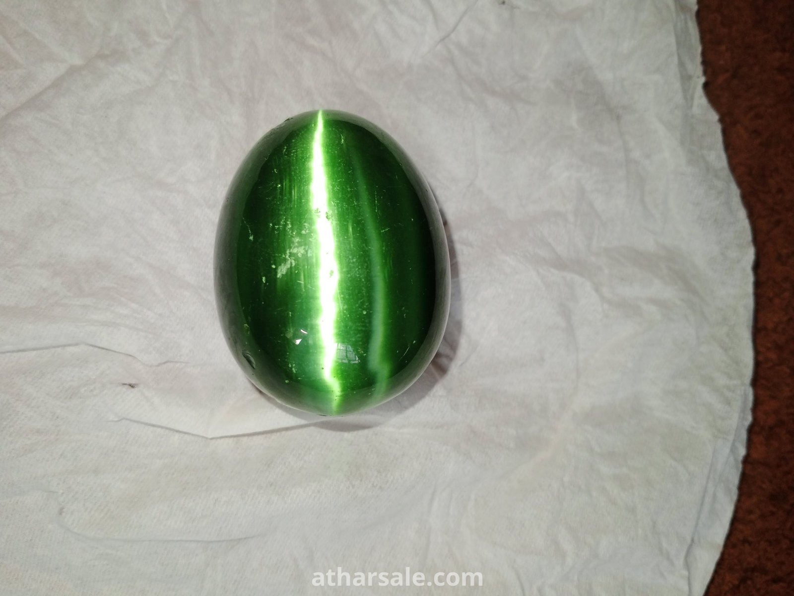 الحجر هو حجر عين القط، ويتميز بظاهرة بصرية فريدة تُعرف باسم "chatoyancy" حيث يظهر شعاع ضوئي أبيض يشبه بؤبؤ عين القط عبر سطحه.