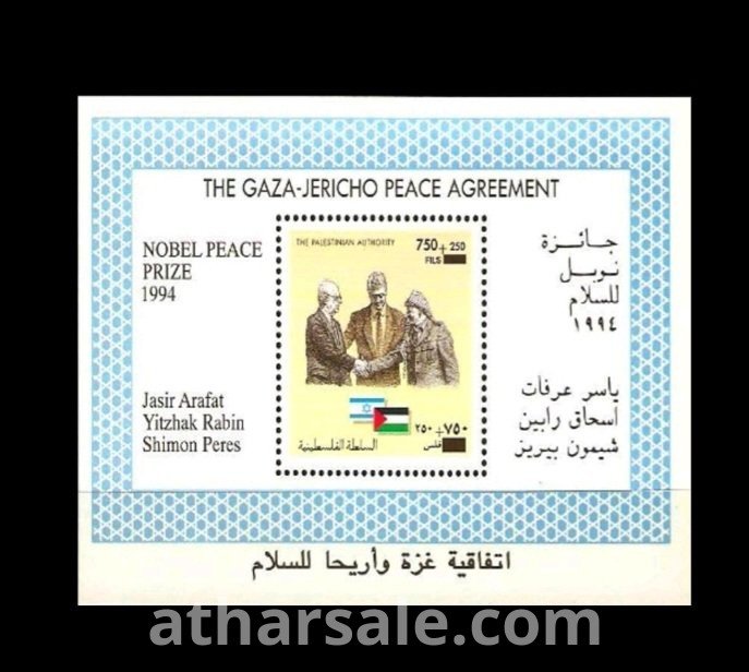البطاقة الأصلية للذكرى الأولى لاتفاق اسلو السلام بين فلسطين وإسرائيل بحضور الرئيس الفلسطيني ياسر عرفات ورئيس الوزراء الإسرائيلي إسحاق رابين والرئيس الامريكي بيل كلينتون