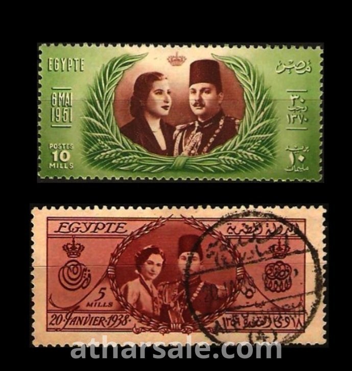 طابع اصلى للملك فروق ملك مصر وزوجتة الاثنين فريدة و ناريمان