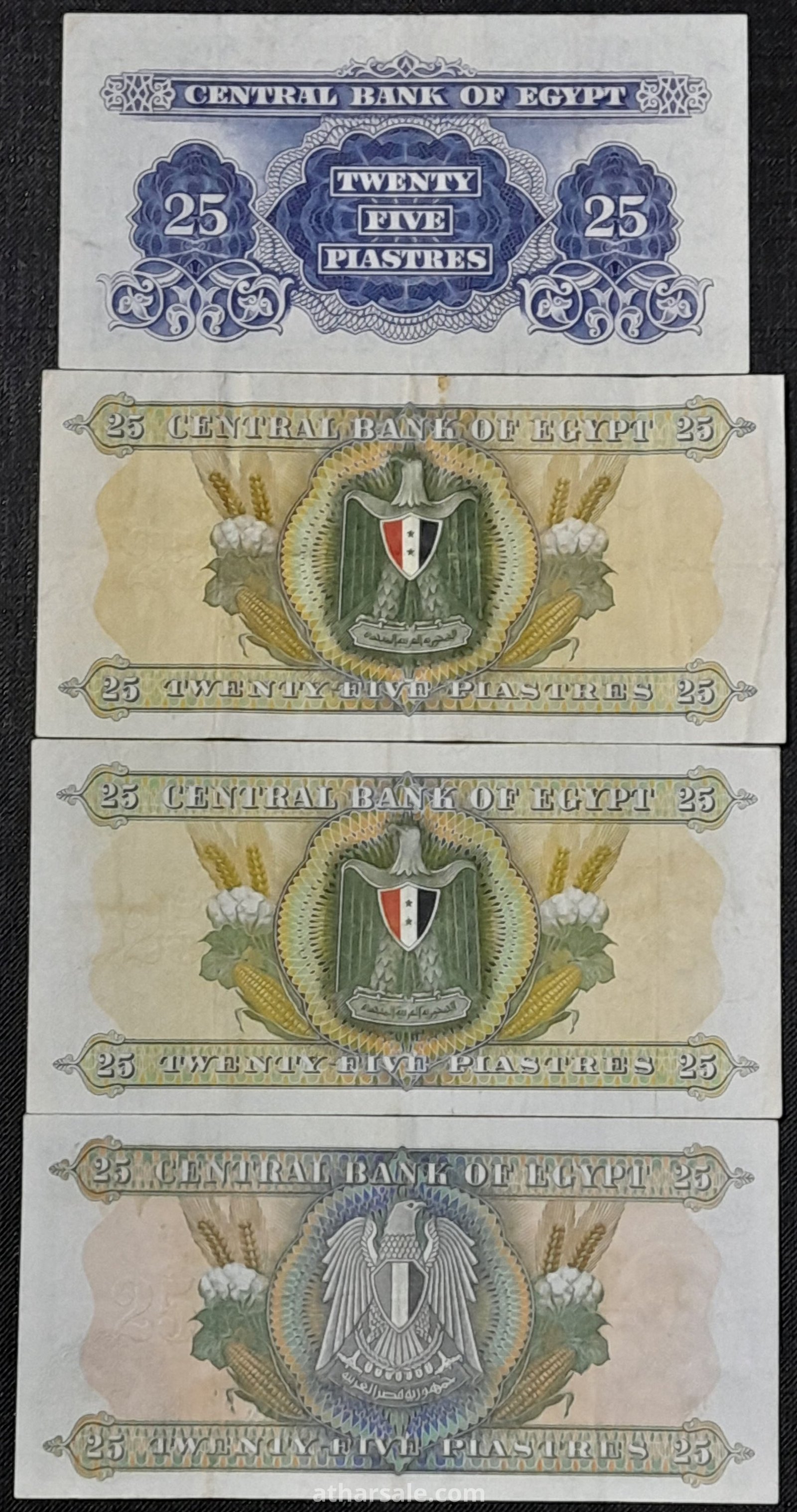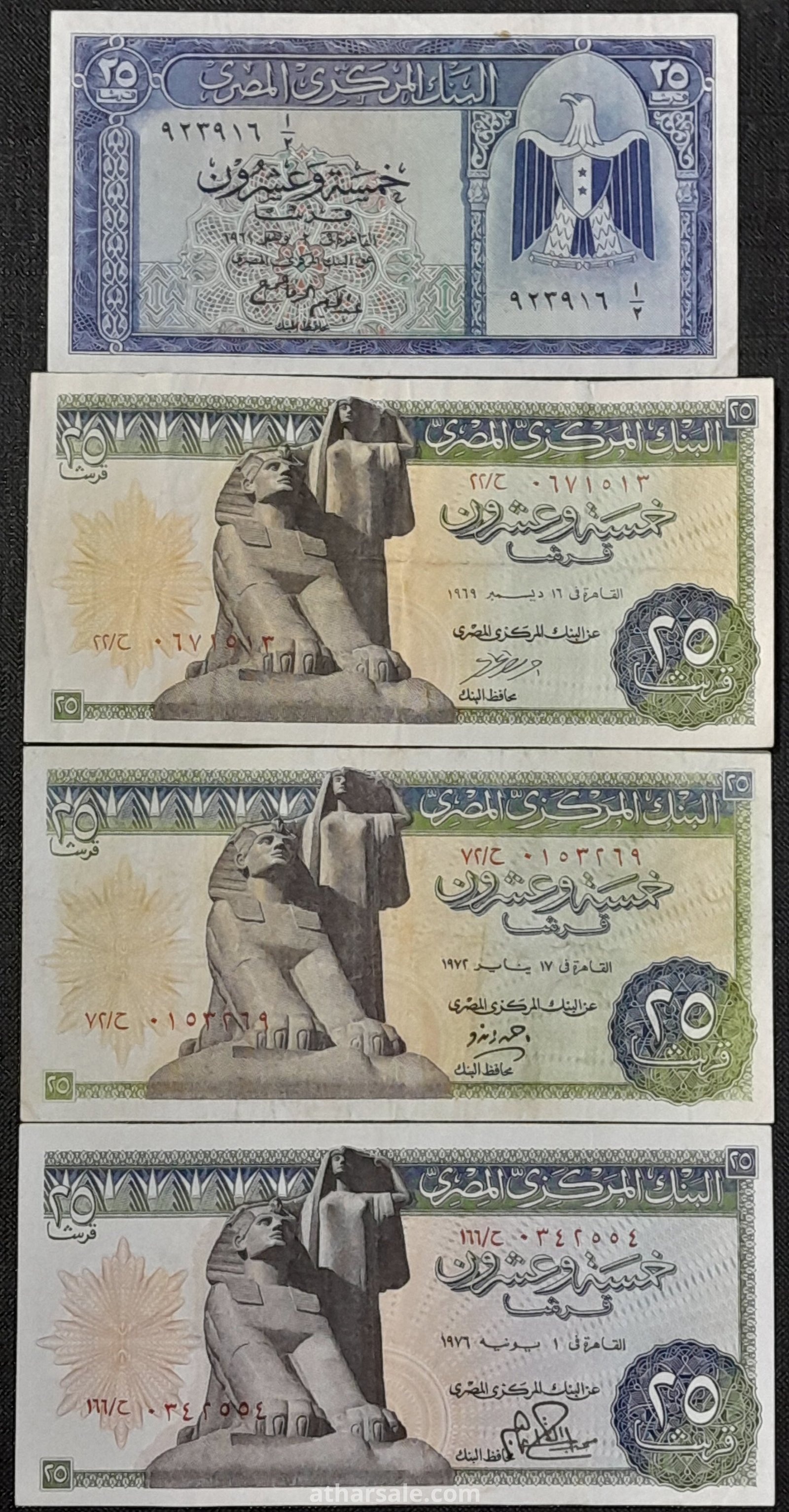4 عملات ورقية مصرية قديمة جميعهم فئة 25 قرشا إصدار البنك المركزي المصري اعوام 62 , 69 , 72 ,76 توقيعات مختلفة