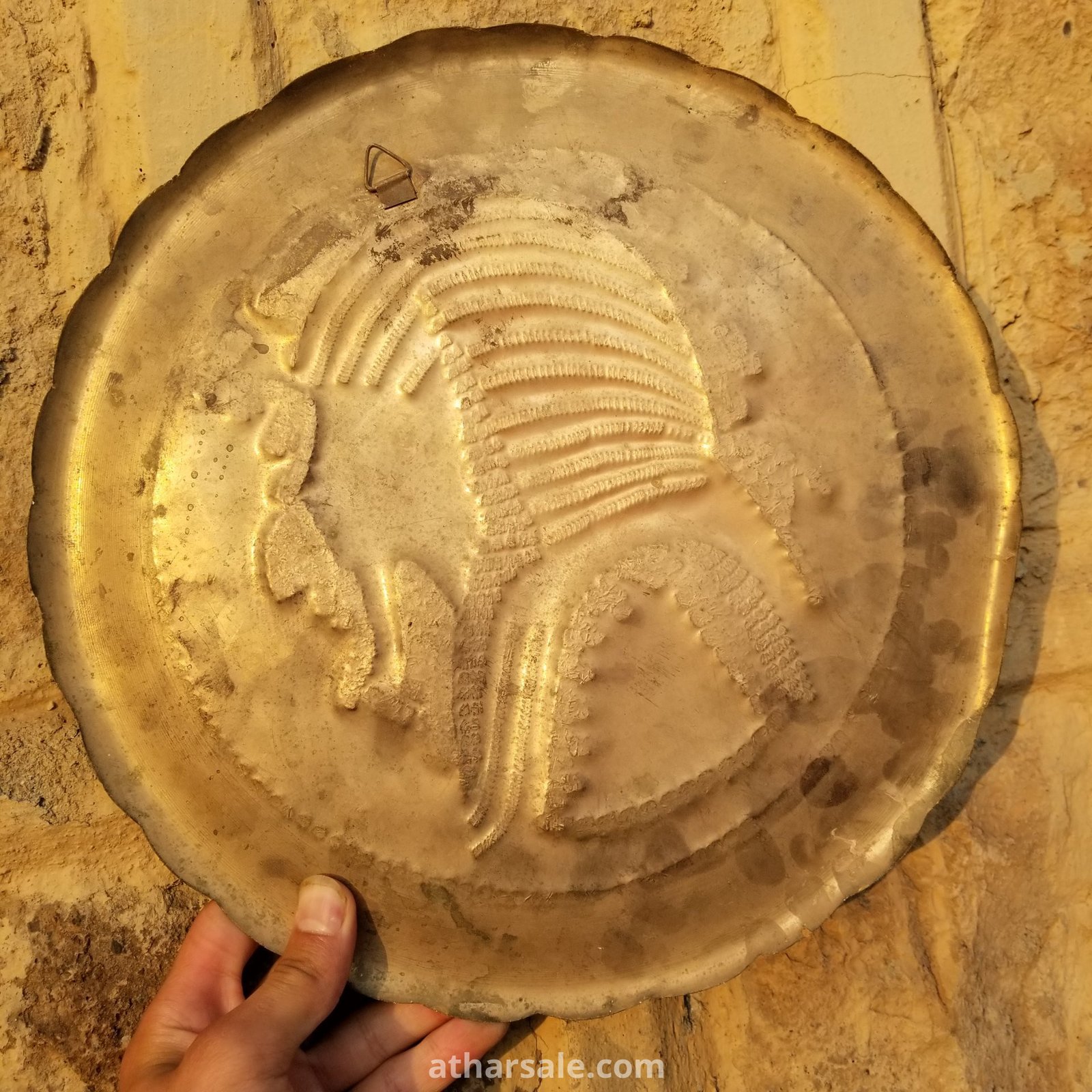 قطعة فنية نادرة، صُنعت يدويًا من النحاس المطروق بتصميم فرعوني مهيب يبرز ملامح أحد الفراعنة القدماء.تتميز بتفاصيل دقيقة وزخارف مذهّبة تضفي عليها طابعًا ملكيًا يعكس عبق الحضارة المصرية القديمة.يُقدَّر عمرها بنحو أكثر من نصف قرن، وهي من الأعمال الحرفية القديمة التي تجمع بين الأصالة والقيمة الفنية.مناسبة للاقتناء أو كقطعة ديكور فريدة تُضفي لمسة تراثية راقية على أي مكان.