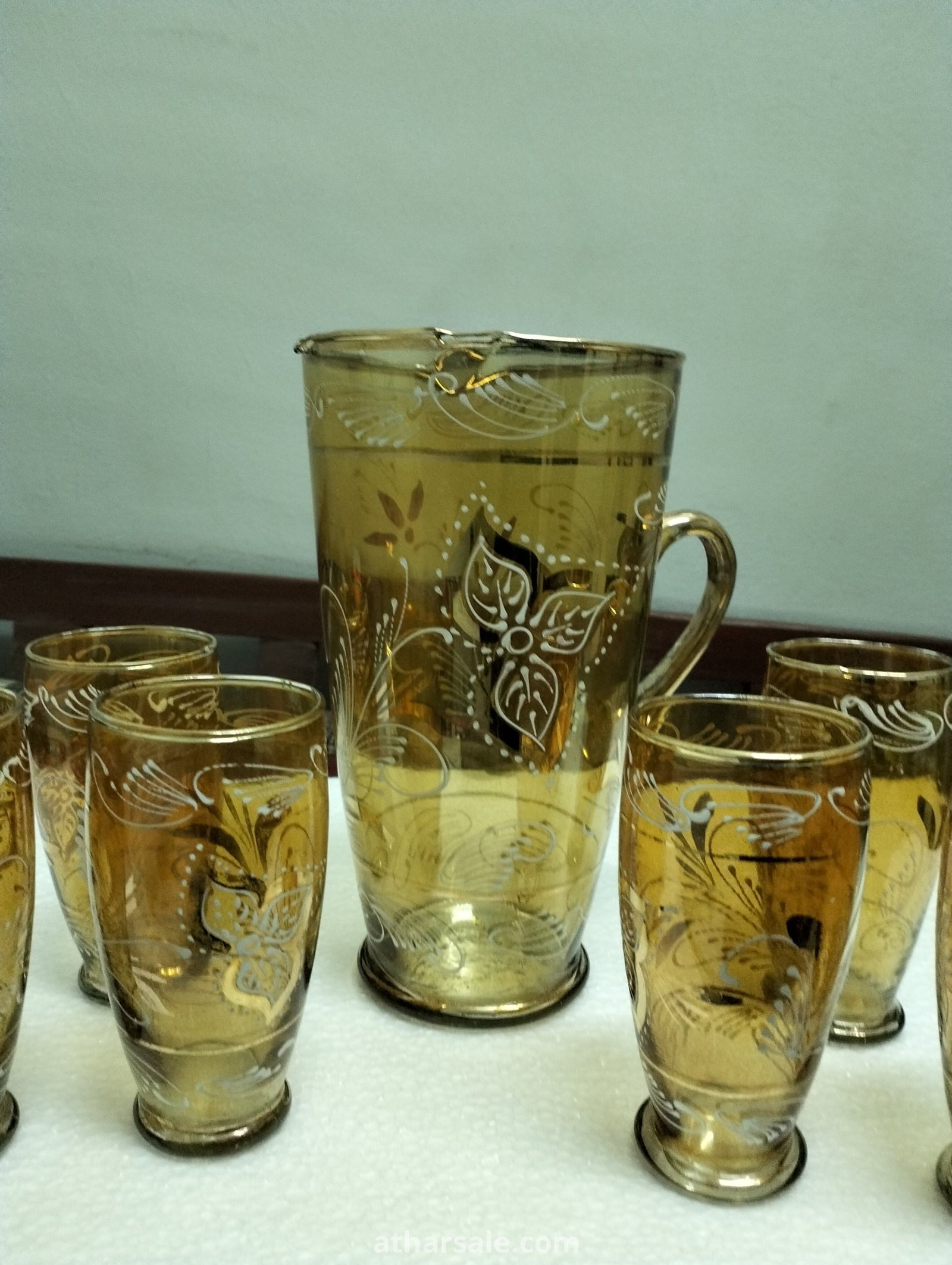 طقم شربات كهرماني عتيق، إبريق 6 أكواب لون الذهبي. . . سعة الإبريق 950 مل، لا يوجد به أي خدوش أو شقوق، خدوش ذهبية بسيطة. سعة الأكواب 200 مل، . حالة الأكواب جيدة جدًا بشكل عام، لا يوجد به أي خدوش أو شقوق.