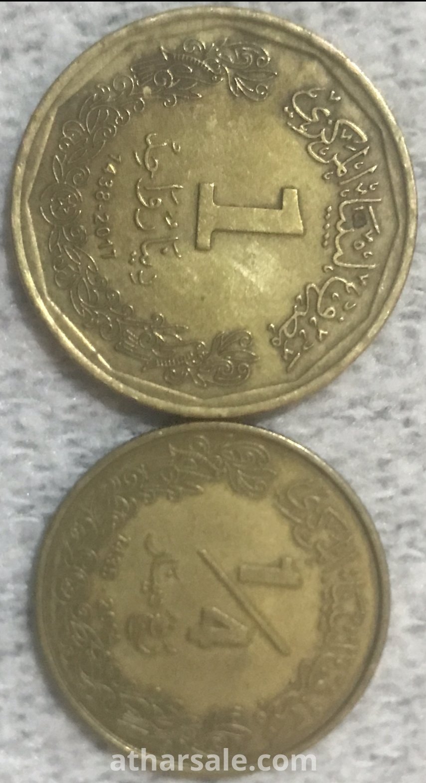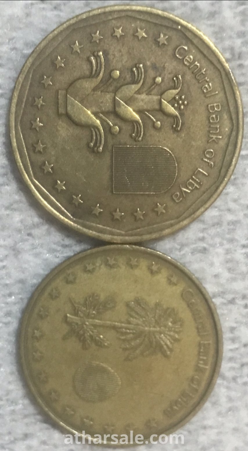 طقم مكون من قطعتين من العملات الليبيه النادره رغم حداثة السك يتميز بوجود علامات مائيه لمنع تقليد العمله