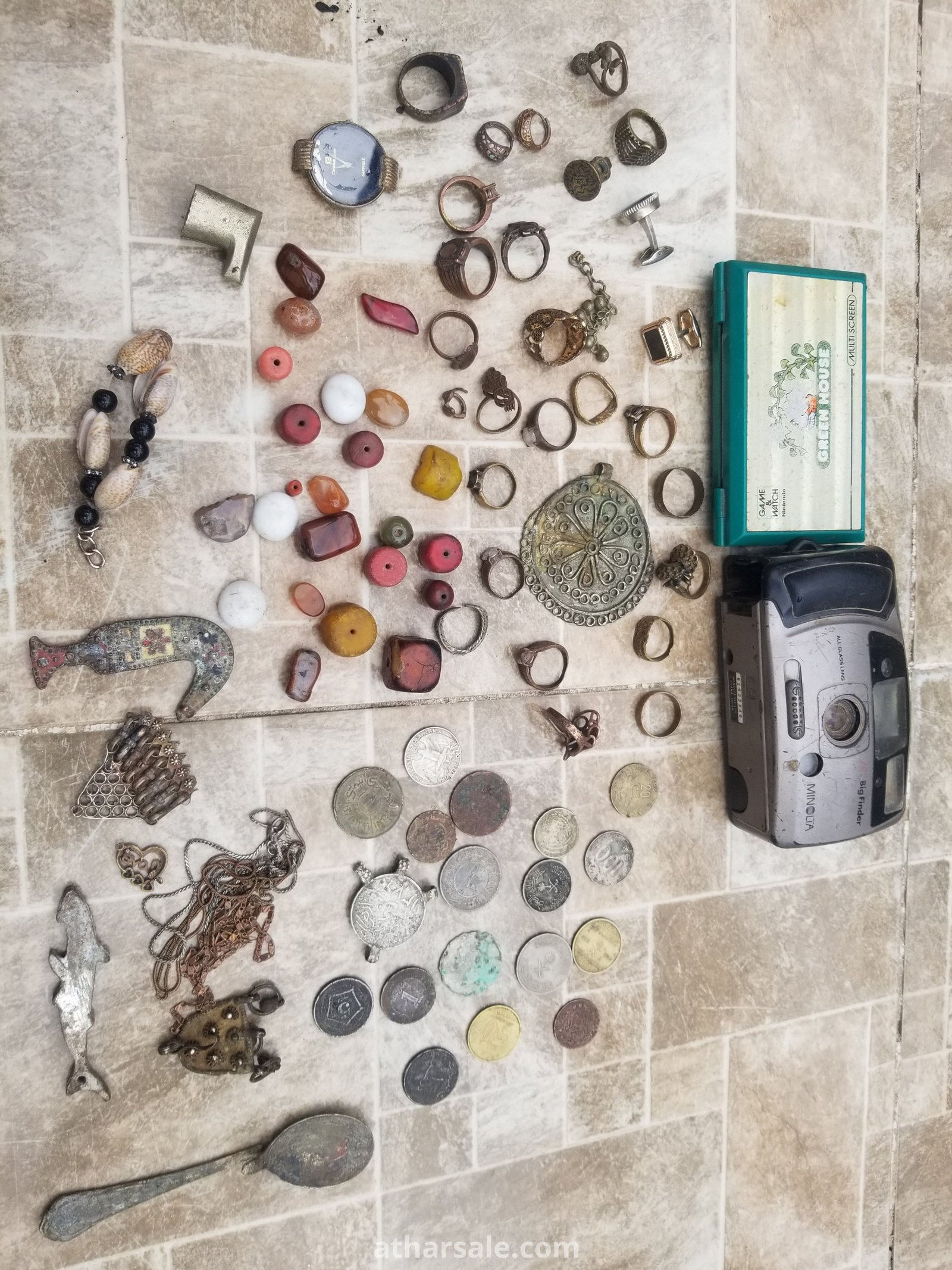 عملات متنوعة قديمة امريكية فرنسية خليجية يمنية قطع فضية ونحاسية قديمة خواتم واحجار وخرز قد تكون عقيق او كهرمان