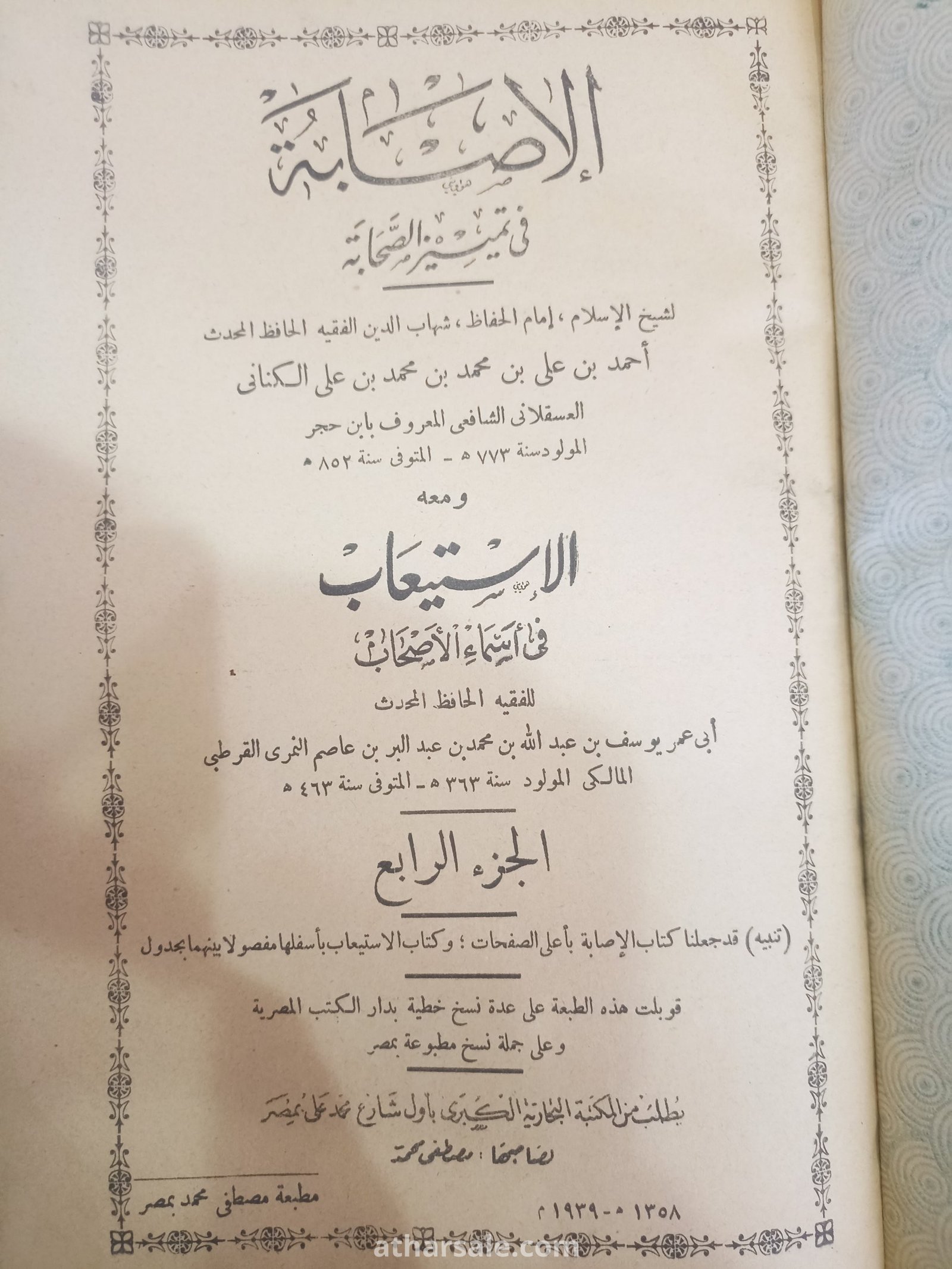 هذا الكتاب الاصابه في تمييز الصحابه ومعه الاستيعاب في اسماء الاصحاب للفقيه المحدث اب عمر بن يوسف بن عبد الله بن محمد بن عبد البر بن عاصم النمري القرطبي يتحدث عن كل الصحابه الذي ورد زكرهم في الكتب والروايات والاحاديث والقران بترتيب حروفهم الابجدي