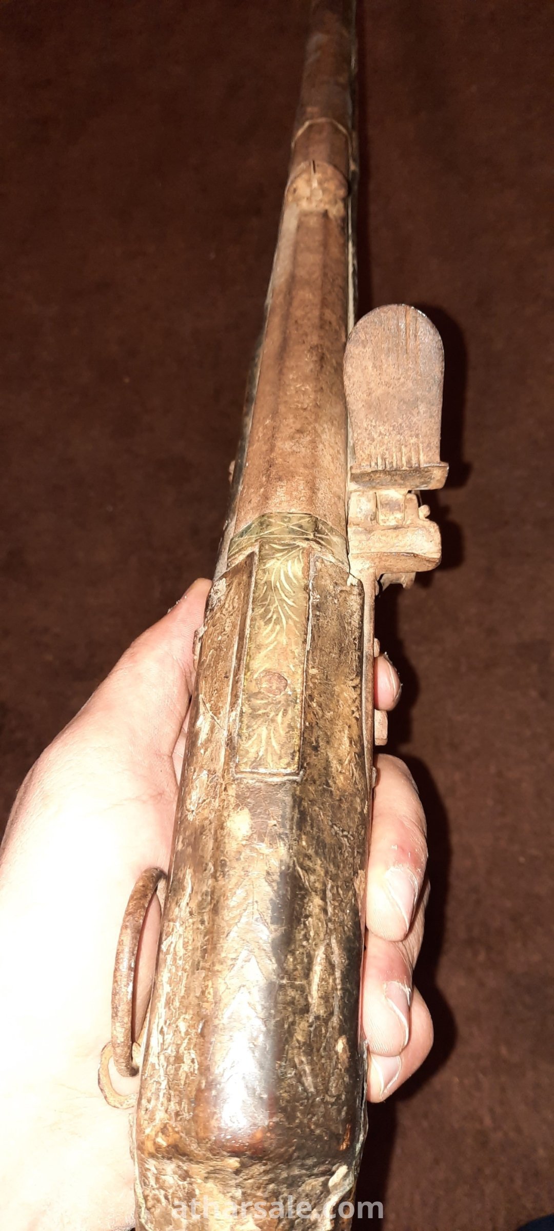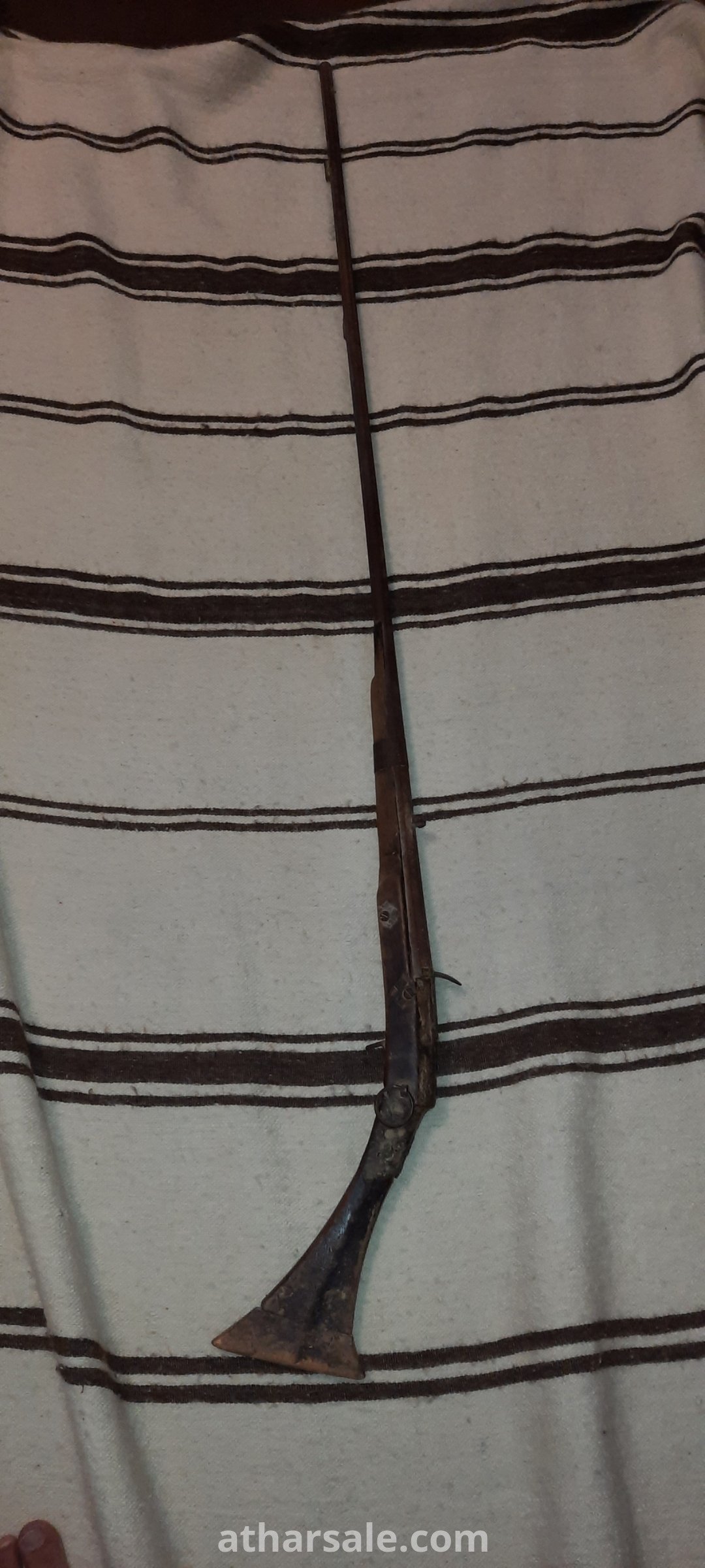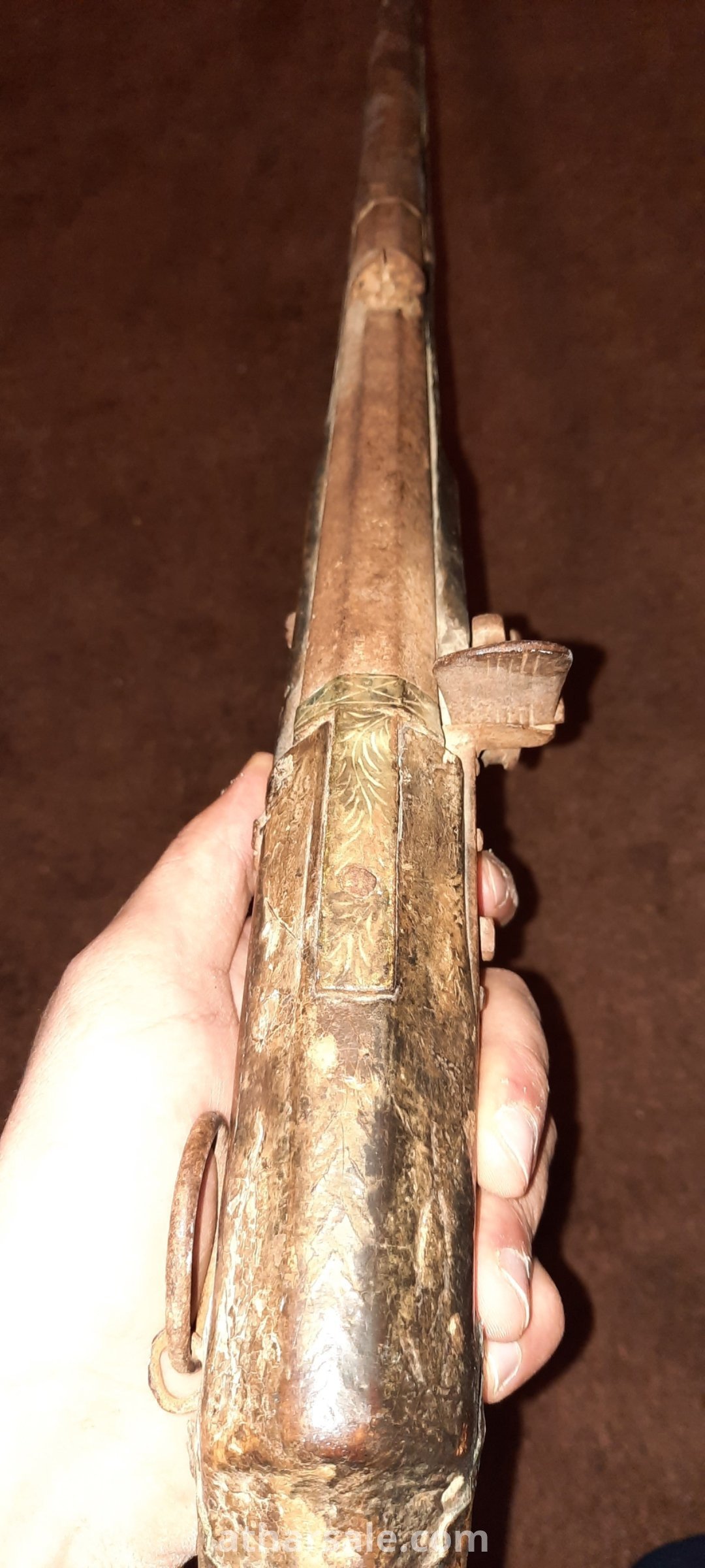 قطعة أثرية مميزة لهواة المقتنيات العسكرية والتراثية. بندقية تقليدية من نوع "مُكحلة" تعود للقرن التاسع عشر، تتميز بدمج فريد بين الحرفية المحلية والجودة الأوروبية.