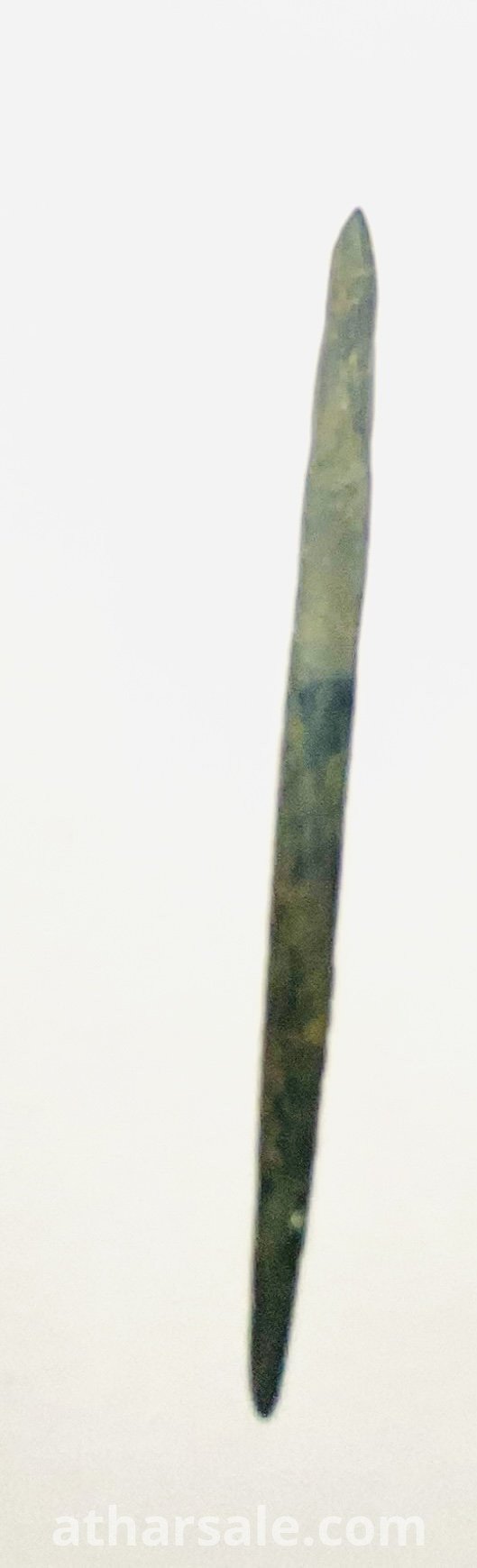 هذا الجسم يشبه نصل سكين أثرية مصنوعة من البرونز، تعود لفترة العصر الحجري الحديث. • المادة: برونز. • الحقبة الزمنية: تعود تقريبياً إلى فترة ثقافة ماجياياو (2000-3200 قبل الميلاد). • الاستخدام: كانت تستخدم كأداة قطع أو سلاح في تلك الحقبة. • الحالة: النصل يظهر عليه آثار الزمن والتاكل نظراً لقدمه الشديد.