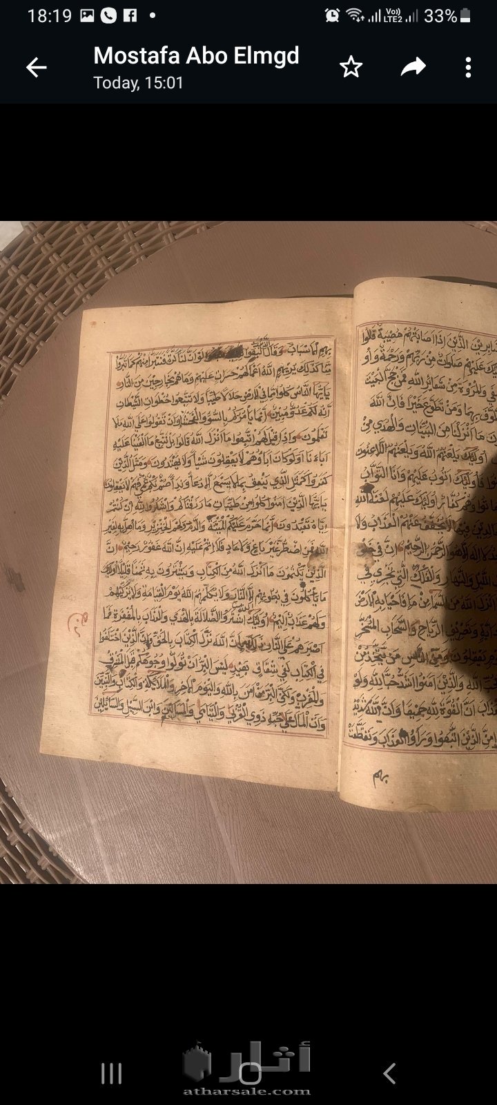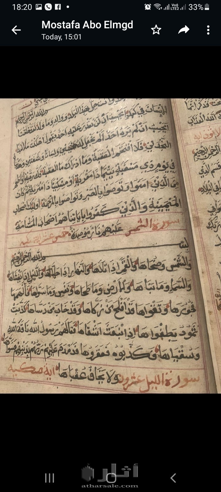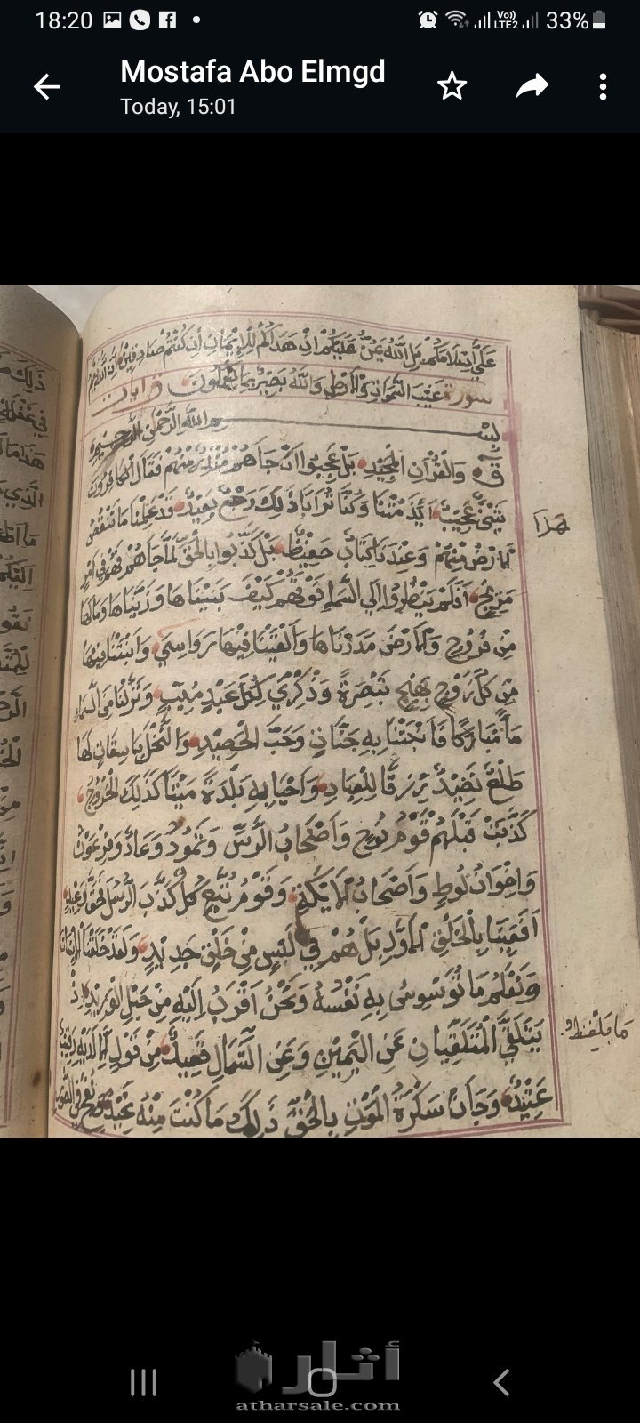 قرآن كريم بخط اليد من سنه ٦٦ هريا وبه نقاط حمراء عند بعض الآيات