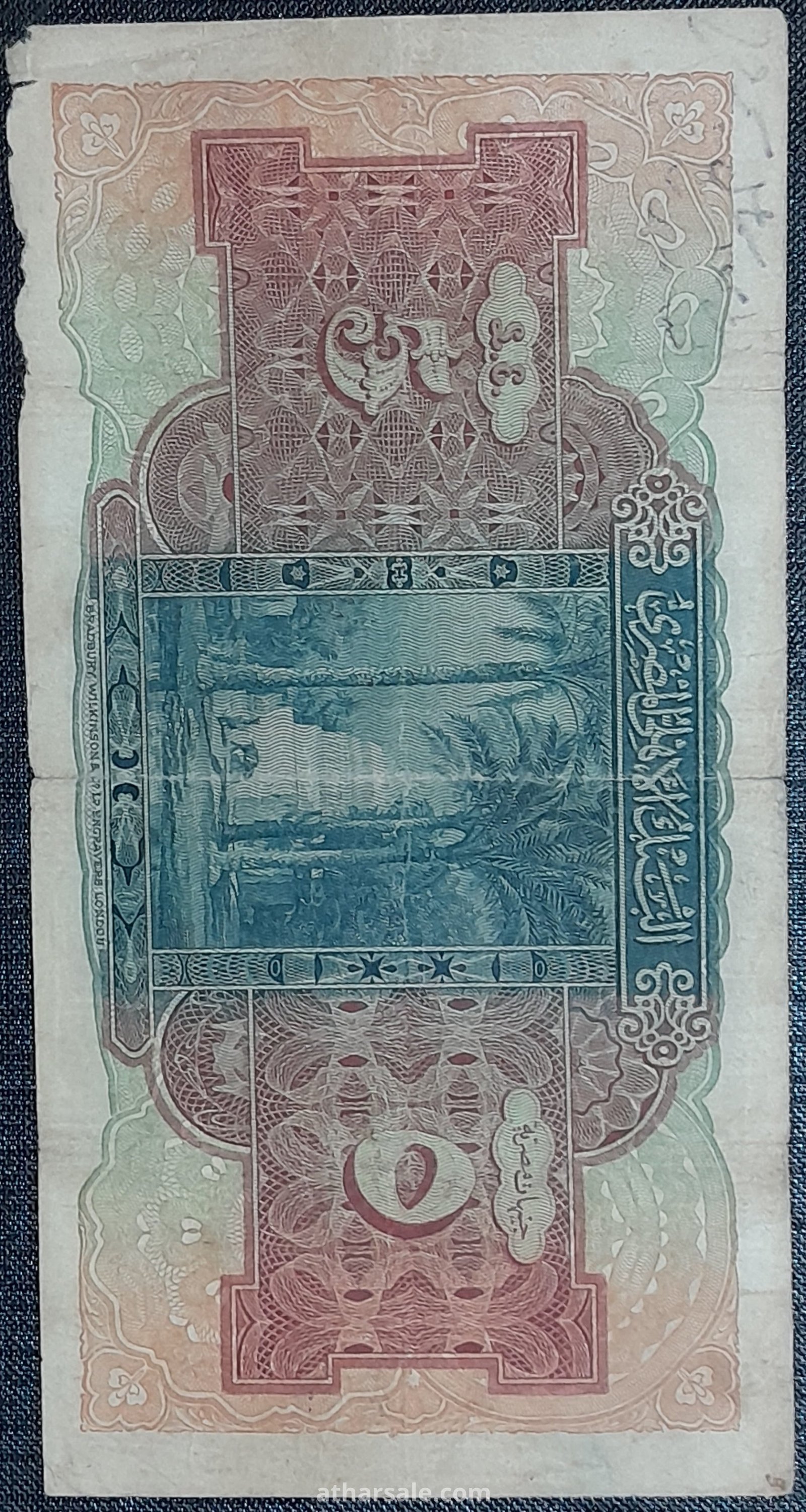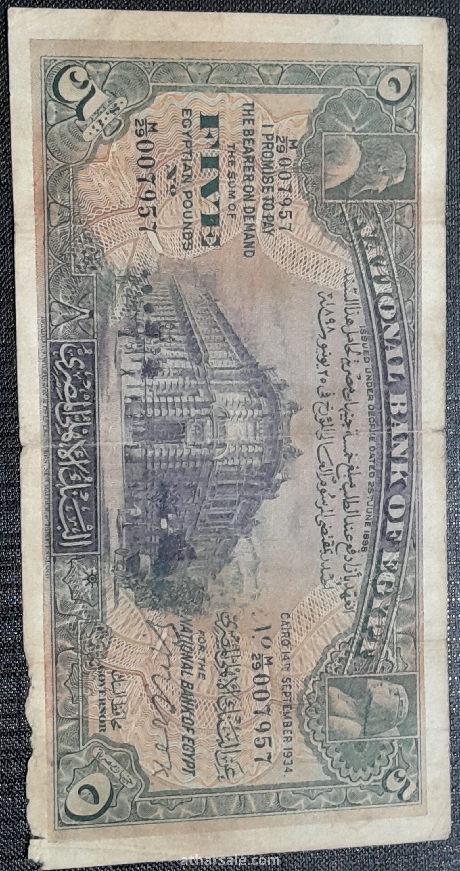 عملة ورقية مصرية قديمة نادرة جدا وقيمه فئة خمسة جنيهات إصدار البنك الأهلي المصري والمشهورة ب ( خمسة جنيهات واجهة البنك ) إصدار عام 1934