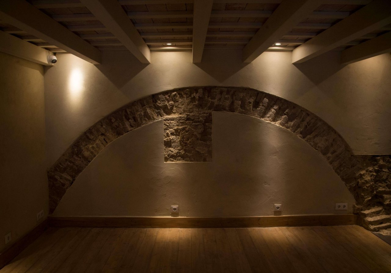 وفوق لوحة الفسيفساء الموجودة أصلا قبل أعمال التجديد يمكن رؤية جدران مزينة وأقواس بيضاء مزخرفة بالنقوش.