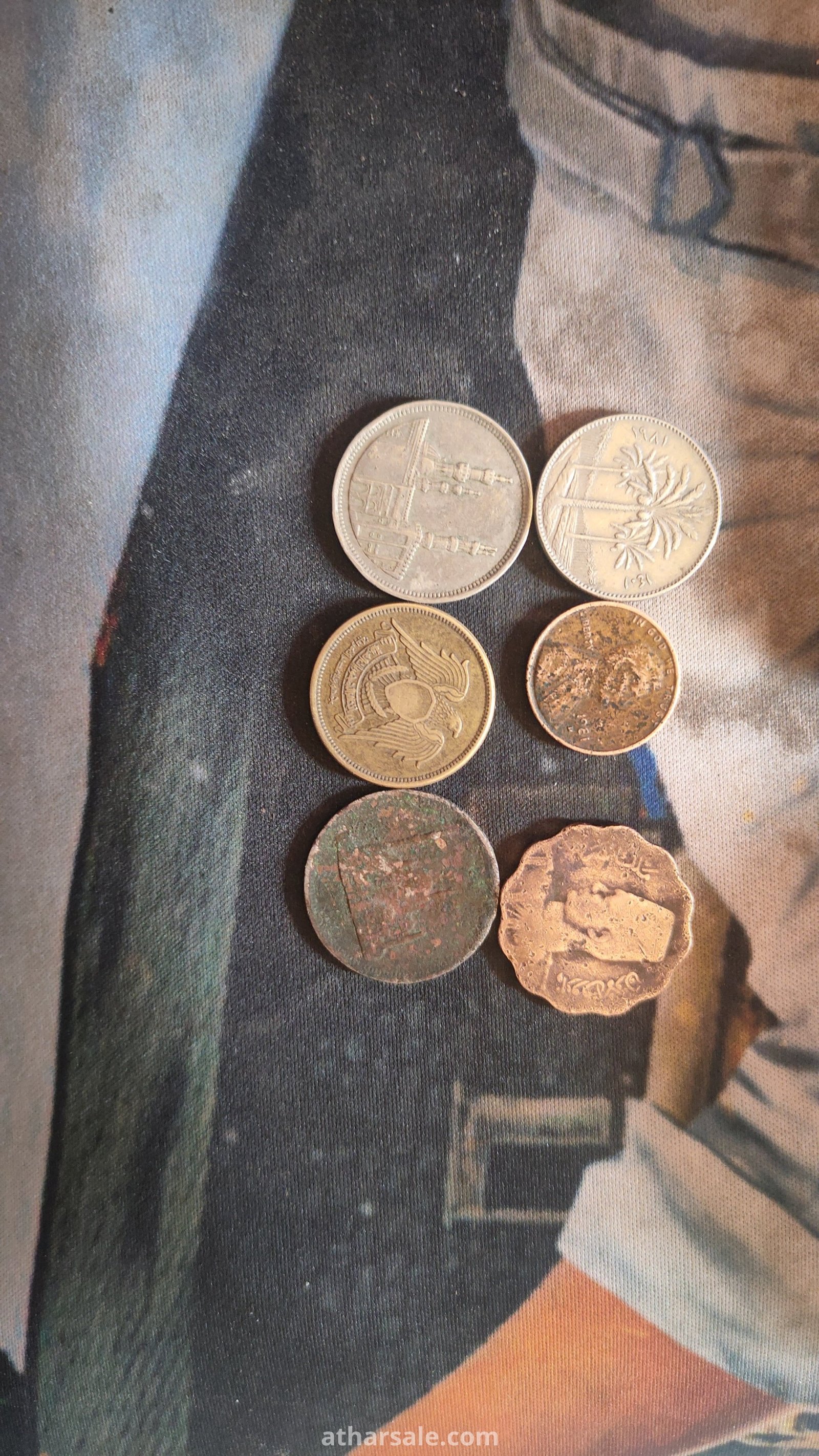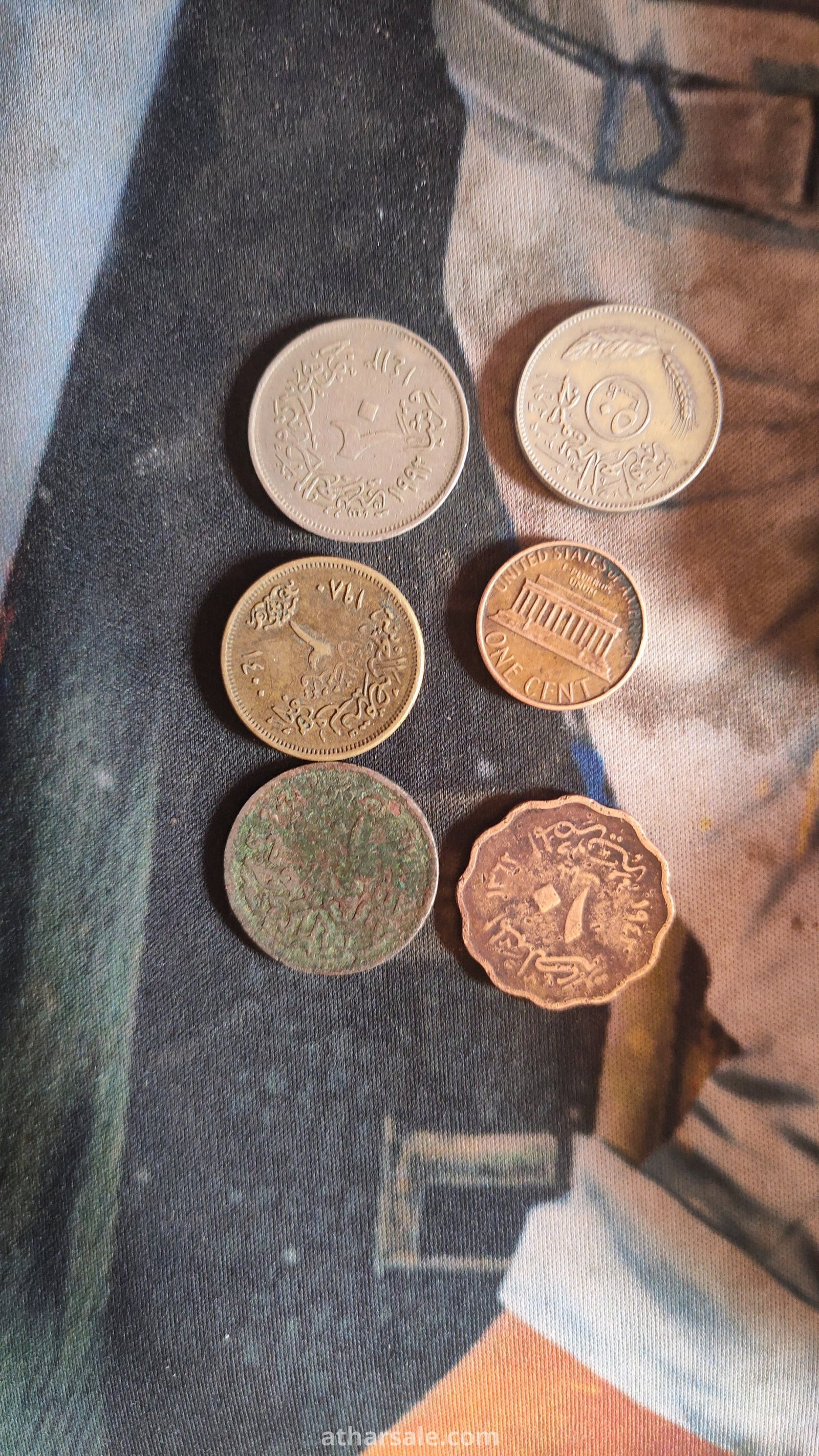 عملات قديمه عملت الملك فروق الاول 1942 .10قروش مصري 1980.جنيه جمهور مصر العربيه 1980.50فرس بتريخ 1981.عمله ايطالي 1981.