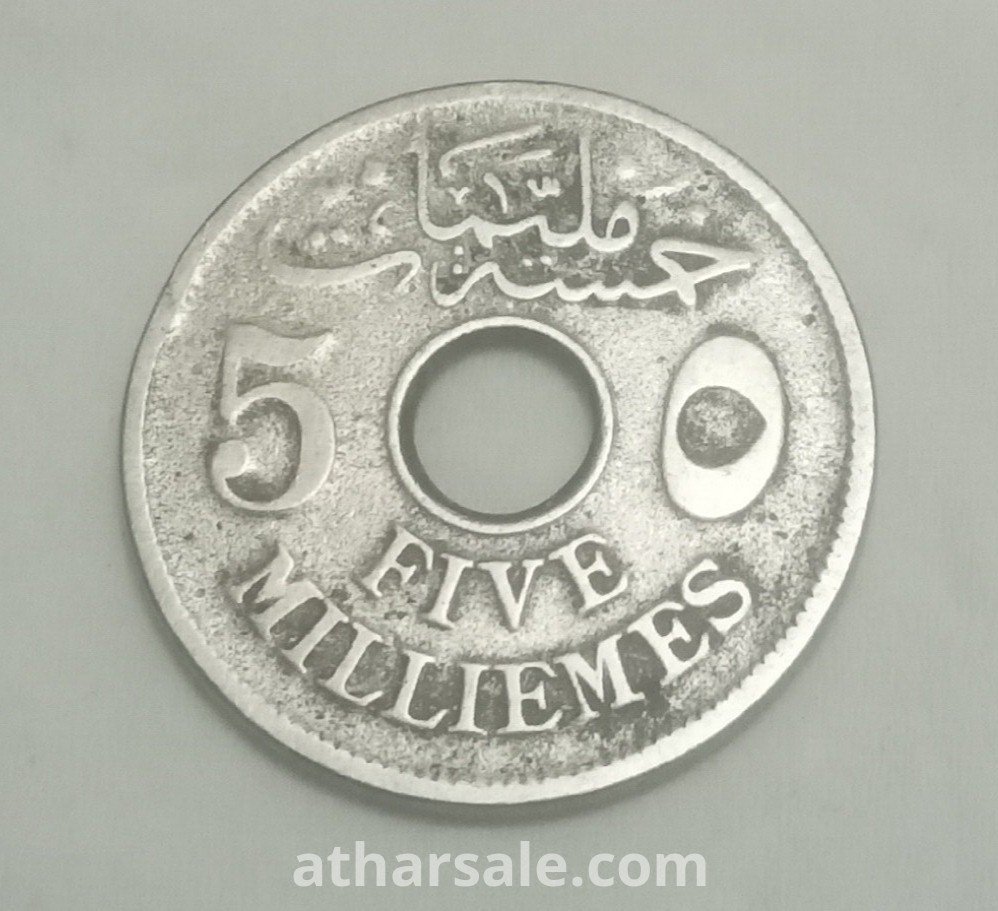 عملة مصرية قديمة للسلطان حسين كامل فئة 5 مليمات تعود لعام 1917م 1335هـ العملة مصنوعة من النحاس والنيكل وزنها 4,6 قطرها 23,15 ملم سمكها 1,45 ملم .