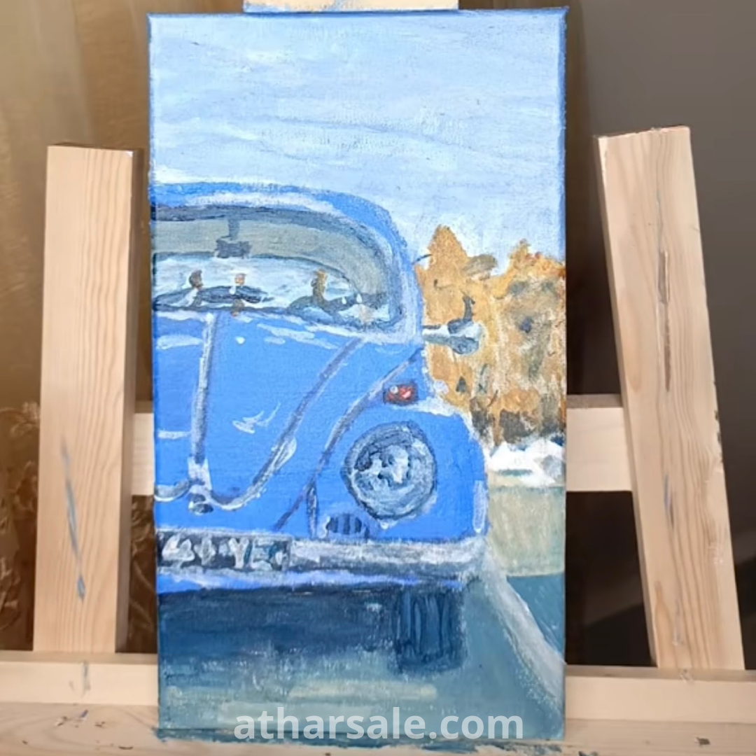 This is an original hand-painted oil painting on stretched canvas, depicting a classic blue Volkswagen Beetle in a serene outdoor scene. The artwork captures the nostalgic charm of the iconic car, set against a soft blue sky and warm autumn trees. Painted with rich textures and vibrant colors, this piece blends realism with an impressionistic touch, making it an eye-catching addition to any art collection or home décor.