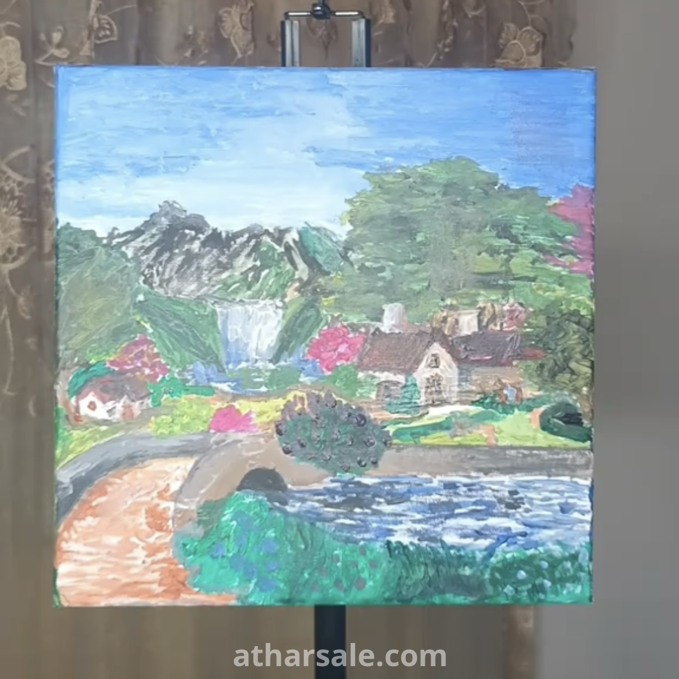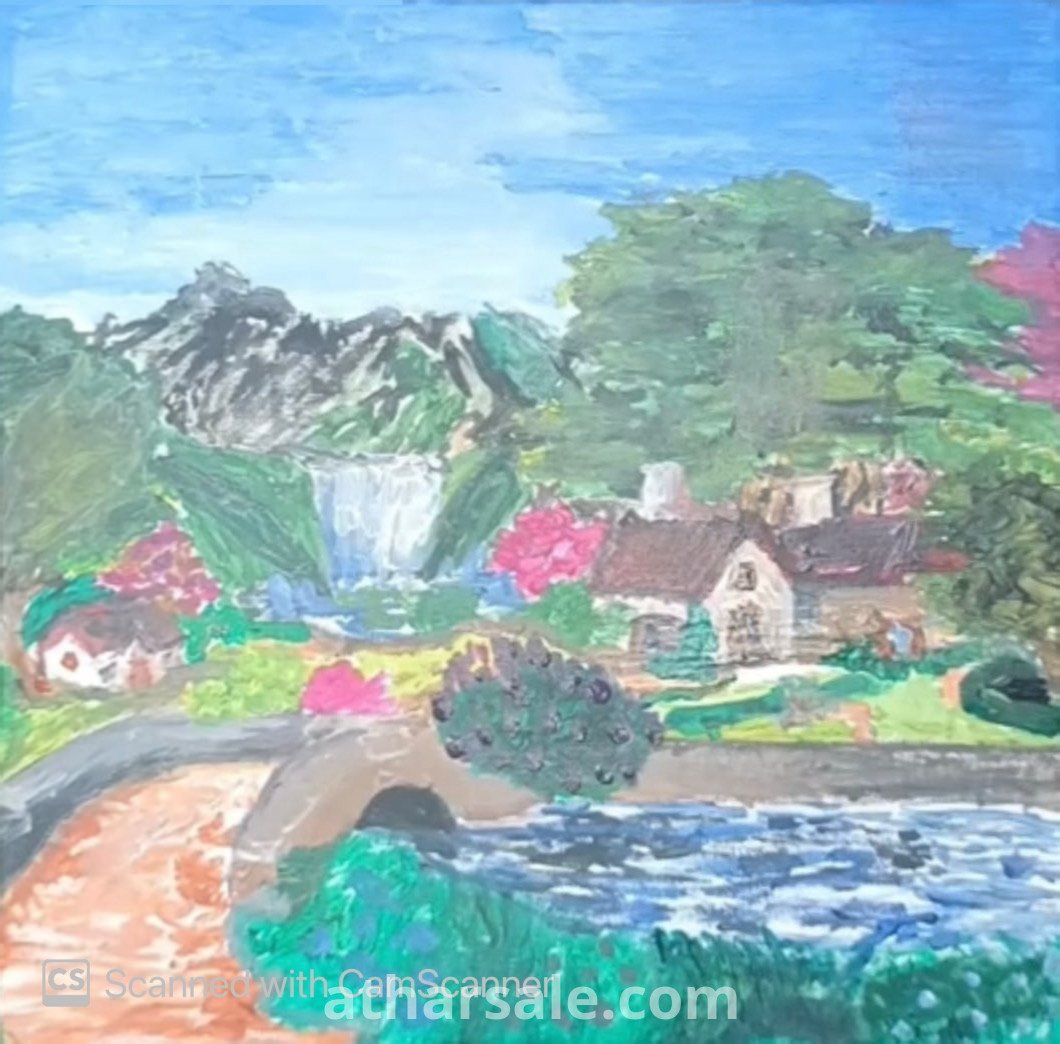 تجسّد العمل الفني مشهدًا طبيعيًا هادئًا، يتميز بأشجار خضراء وارفة، وبعض الأشجار المرسومة بدرجات عنابية فاتحة، وزهور ملونة، ومنزلين ساحرين، ونهر يتدفق تتخلله شلال صغير، وجسر أنيق. السماء مرسومة بدرجة زرقاء هادئة مع لمسات سحابية ناعمة، يتكامل معها جبل بعيد وعشب أخضر نابض بالحياة يغطي المقدمة.